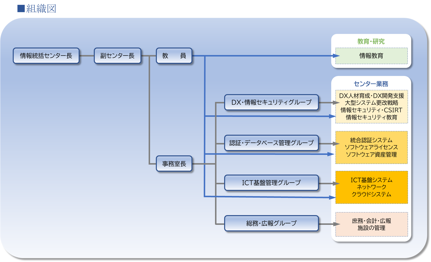 | 総務・広報グループ | 情報統括センターの庶務、会計、広報、施設の管理を担当します。 |